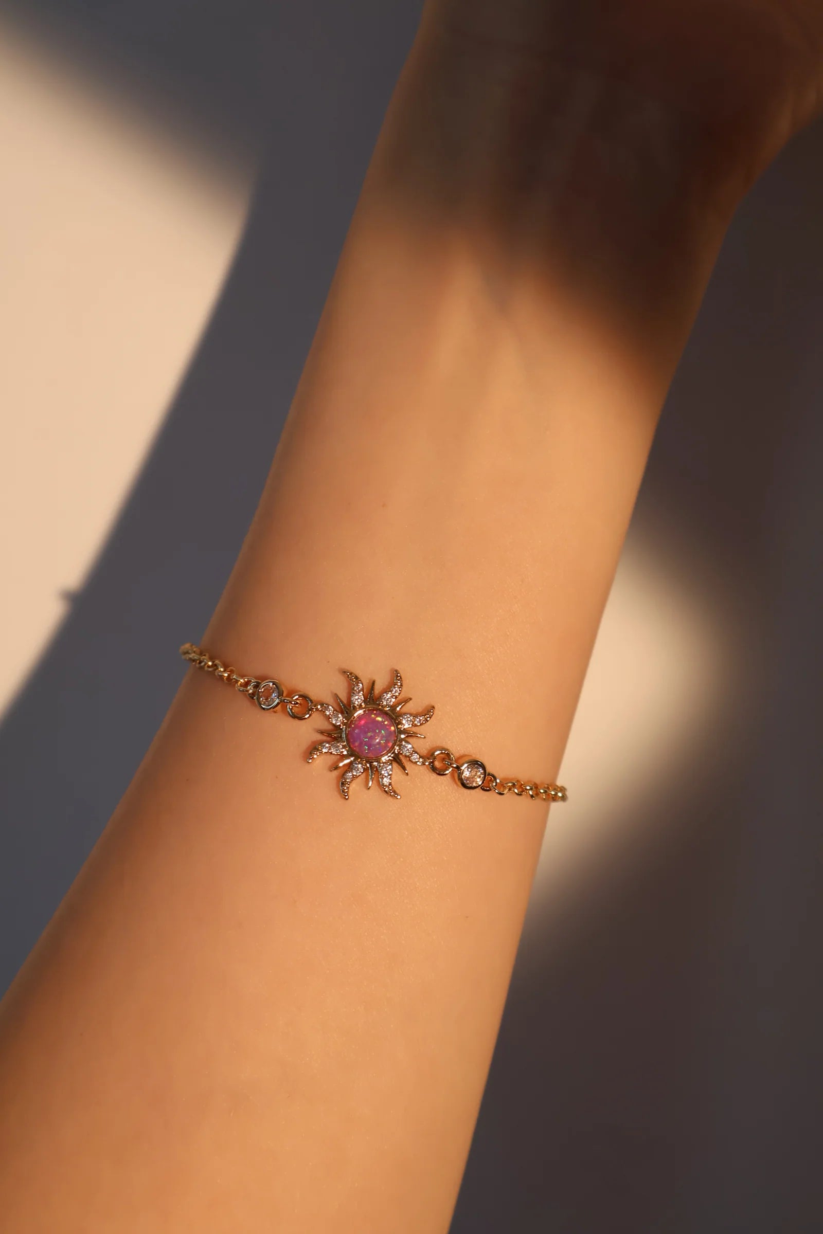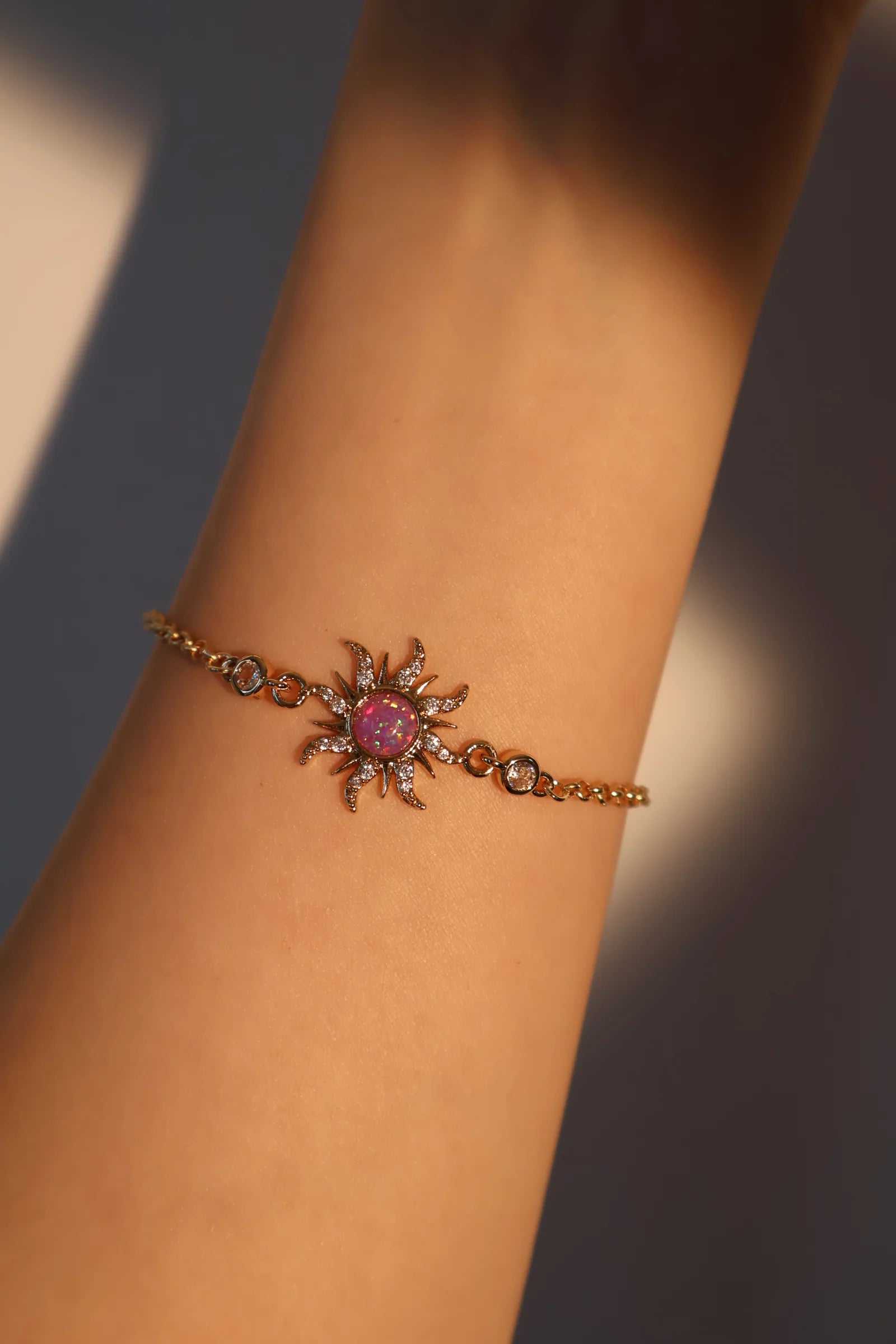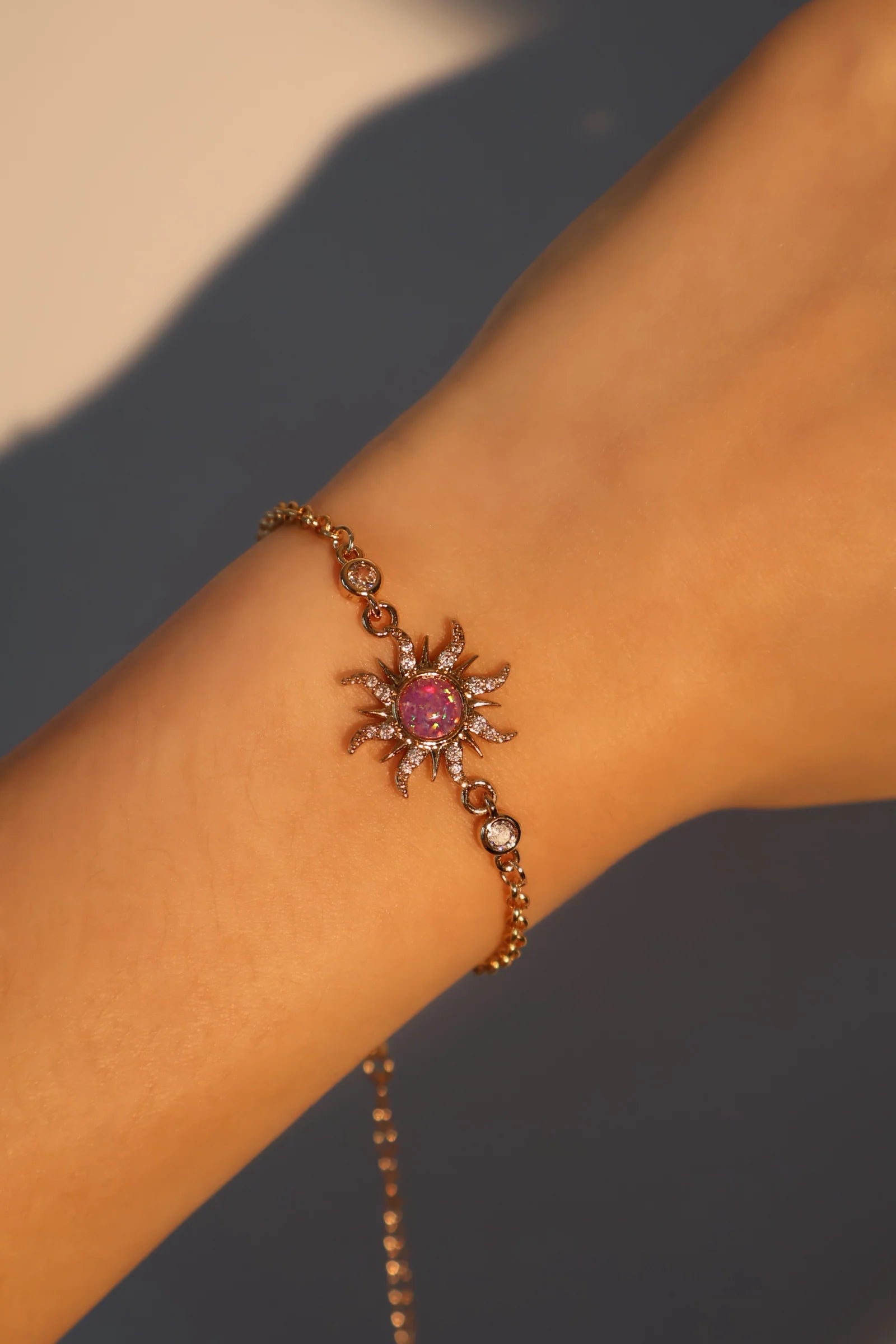 Matlığa veda edin ve 14 Ayar Altın Mor Opal Güneş Bilekliğimiz ile öne çıkın. Uygun ışıkta, zirkon taşlar kombininize göz alıcı bir parlaklık katar. Bu eşsiz bileklik kıyafetinizi öne çıkarır ve aynı zamanda onun için harika bir hediyedir.