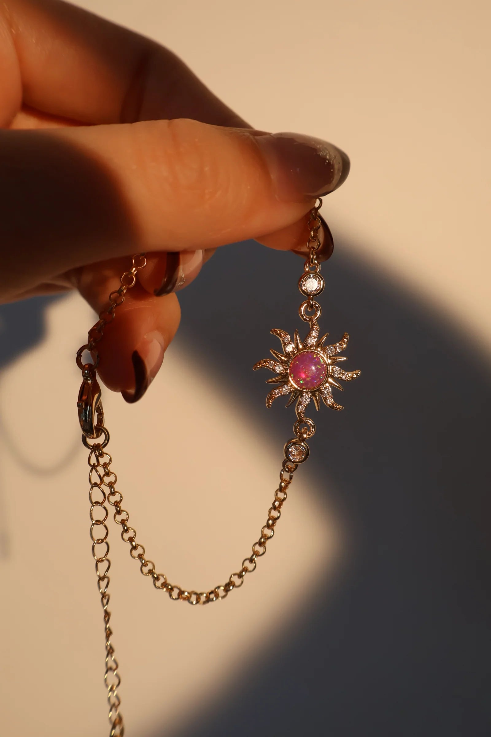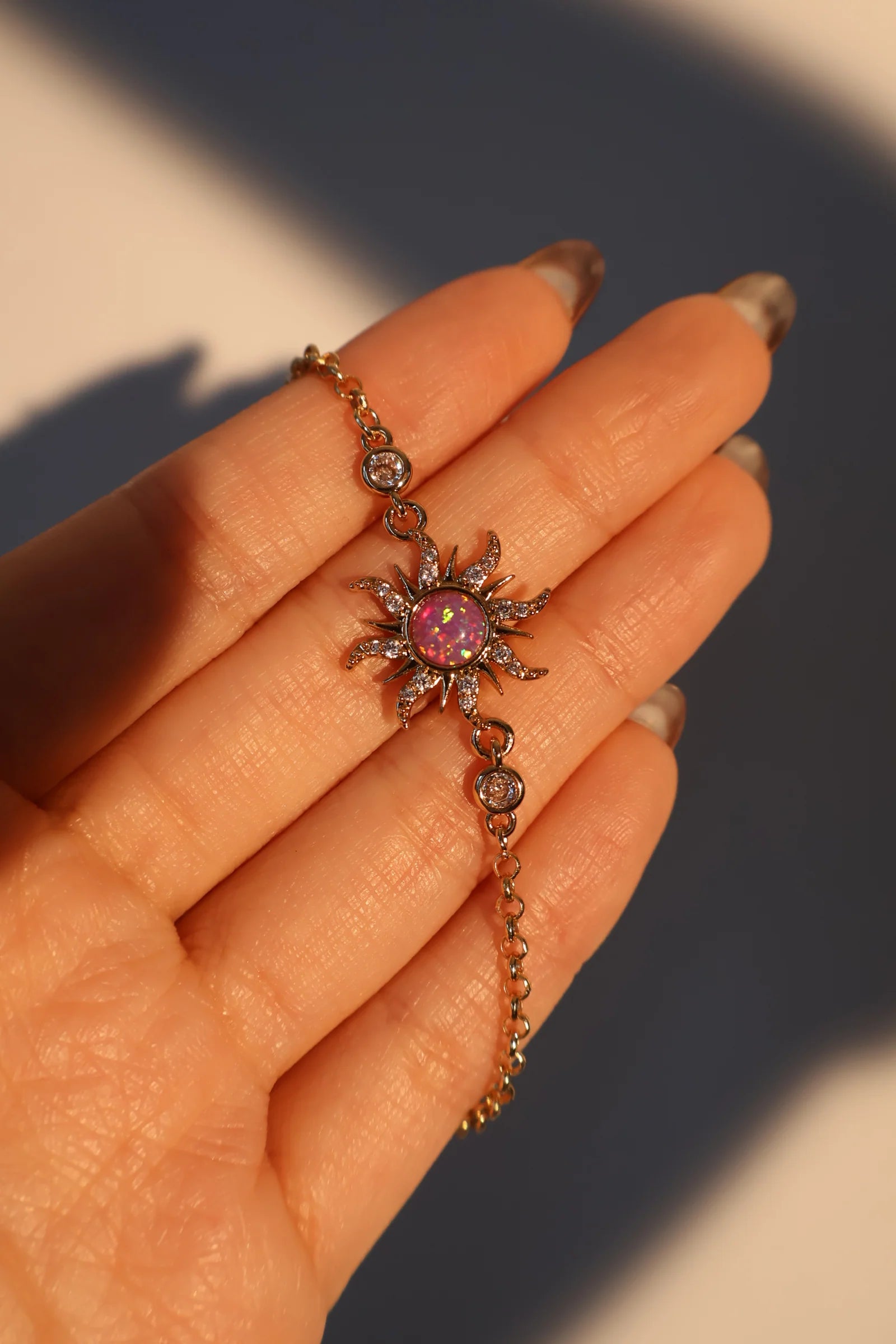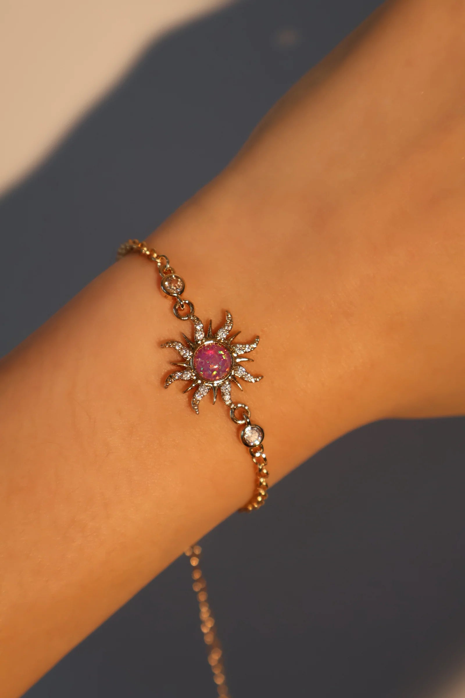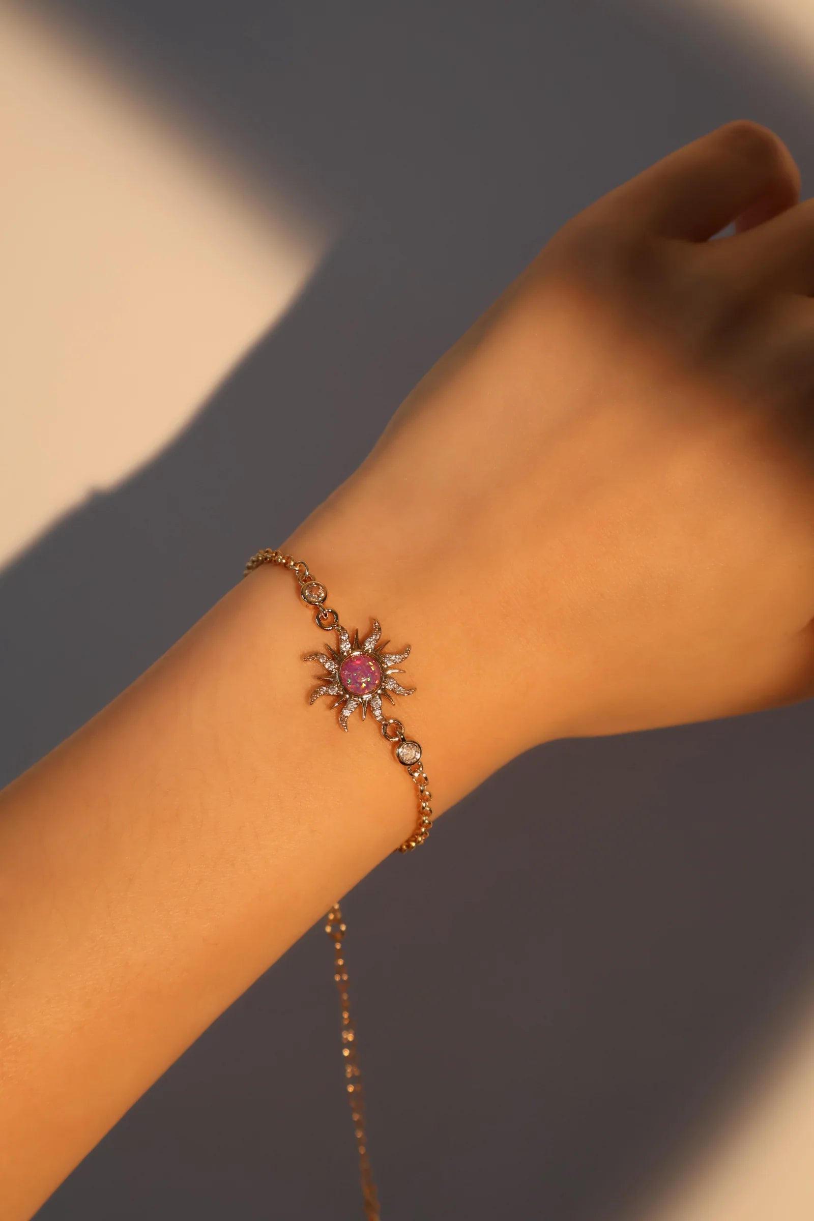 Matlığa veda edin ve 14 Ayar Altın Mor Opal Güneş Bilekliğimiz ile öne çıkın. Uygun ışıkta, zirkon taşlar kombininize göz alıcı bir parlaklık katar. Bu eşsiz bileklik kıyafetinizi öne çıkarır ve aynı zamanda onun için harika bir hediyedir.