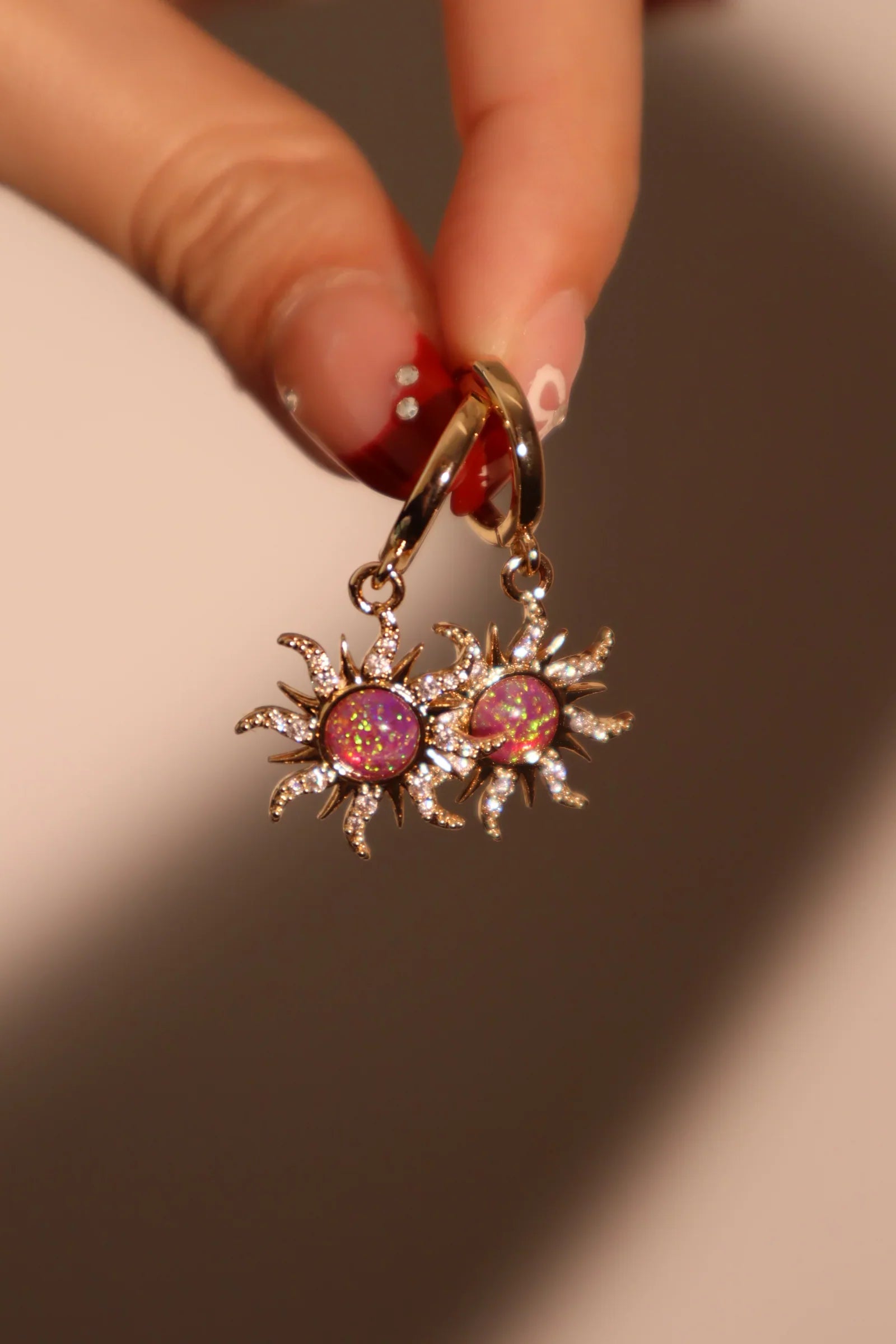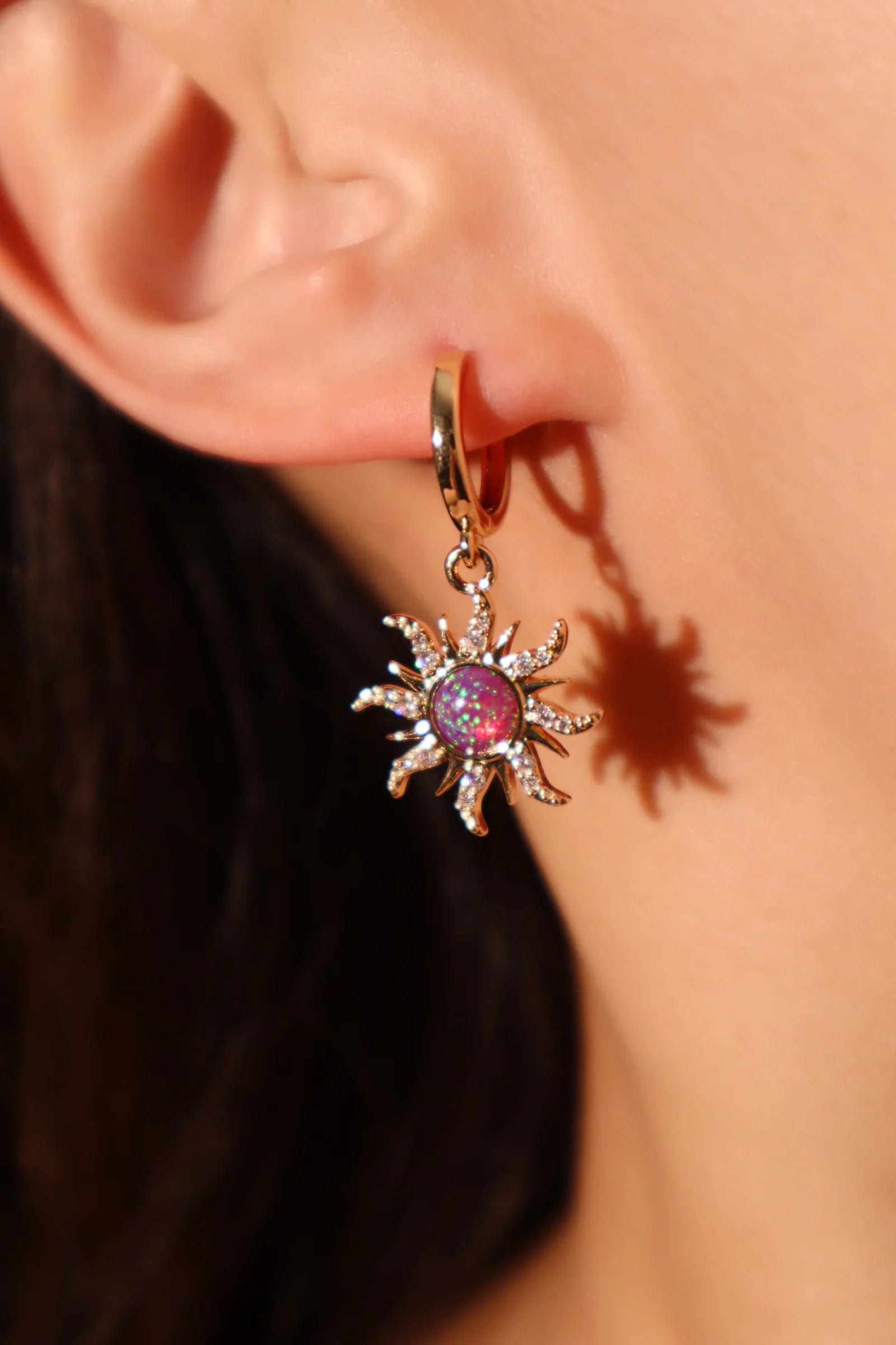 🌟 14K Gerçek Altın Kaplama Mor Opal Güneş Küpelerimiz büyüleyici bir güzelliğe sahip. Bu küpe çifti, melekler kadar parlaklık ve ışıltıya sahip yüksek kaliteli zirkon elmaslar ve opallerle süslenmiştir. Ne giyeceğinize karar veremediğinizde, bu küpeleri kıyafetinizle eşleştirerek kurtarıcınız olmalarına izin verin!