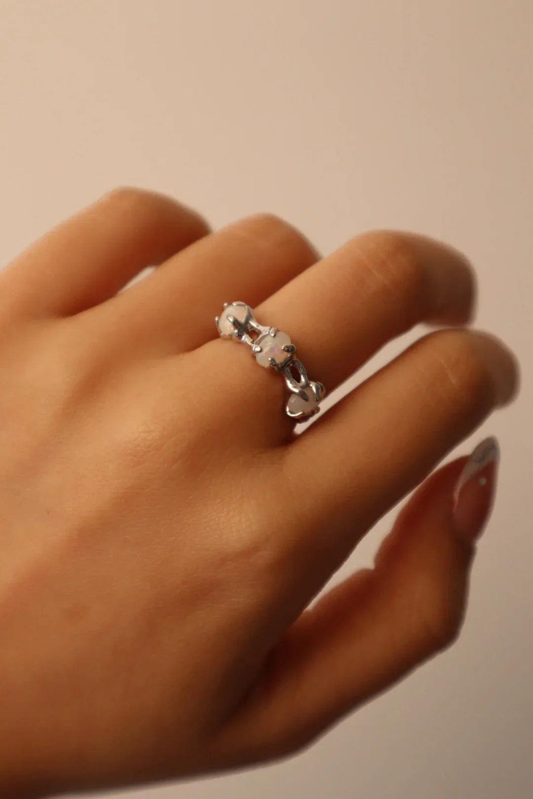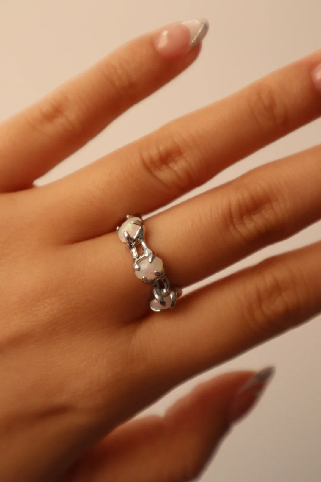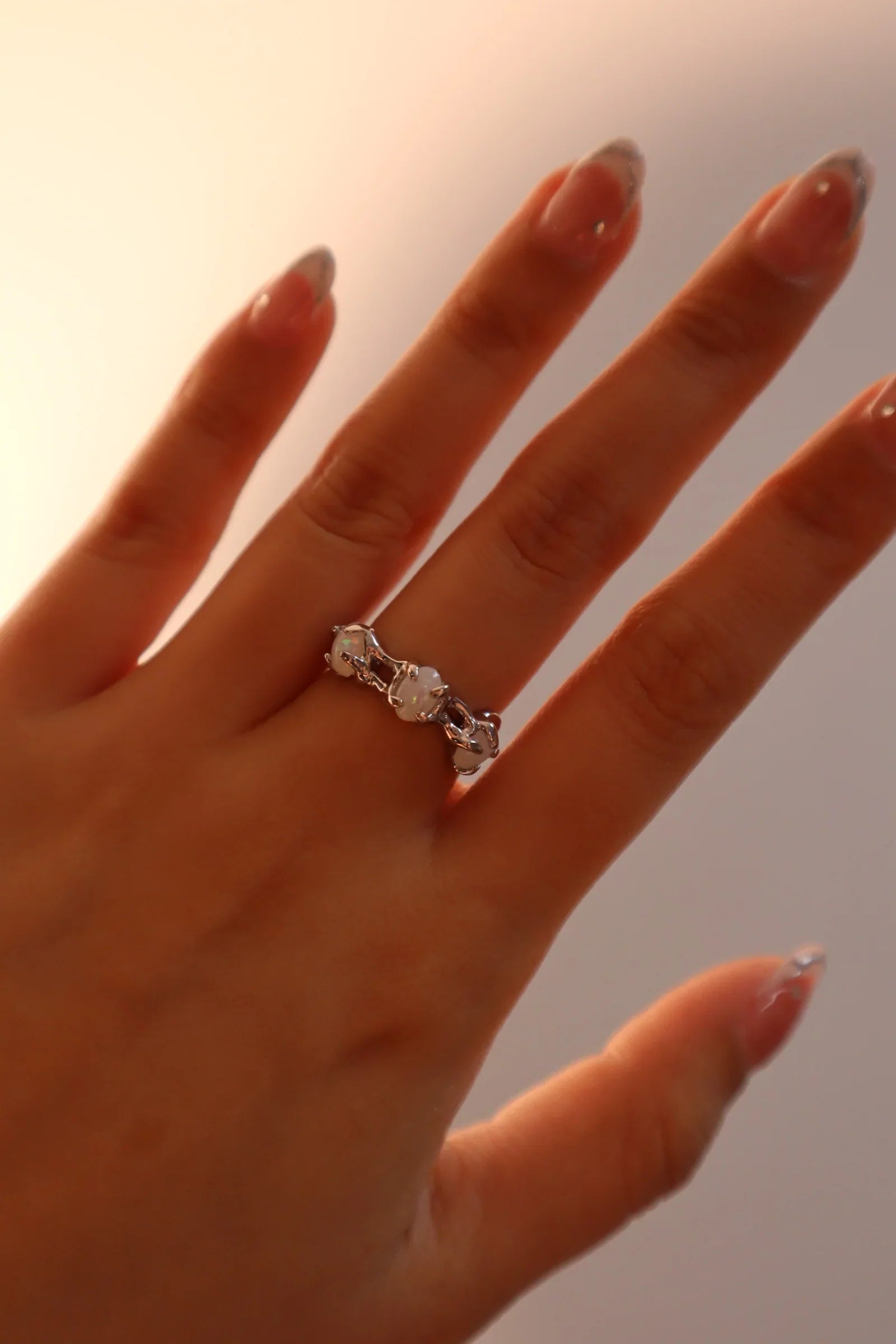 Tarzınızı sevimli opal taşlı yüzüğümüzle canlandırın! Su geçirmez gümüş bant üzerinde üç adet opal taş bulunan bu yüzük, ihtiyacınız olduğunda doğru parıltıyı sağlayarak özel ışıltısıyla herhangi bir gece için mükemmel bir aksesuar haline gelir. Bunu yaparken bir de tırnak fotoğrafı çekmeyi unutmayın! Bu yüzük, en iyi arkadaşınıza veya sevdiğiniz birine yıllarca değer verecekleri harika bir hediye de olacaktır.