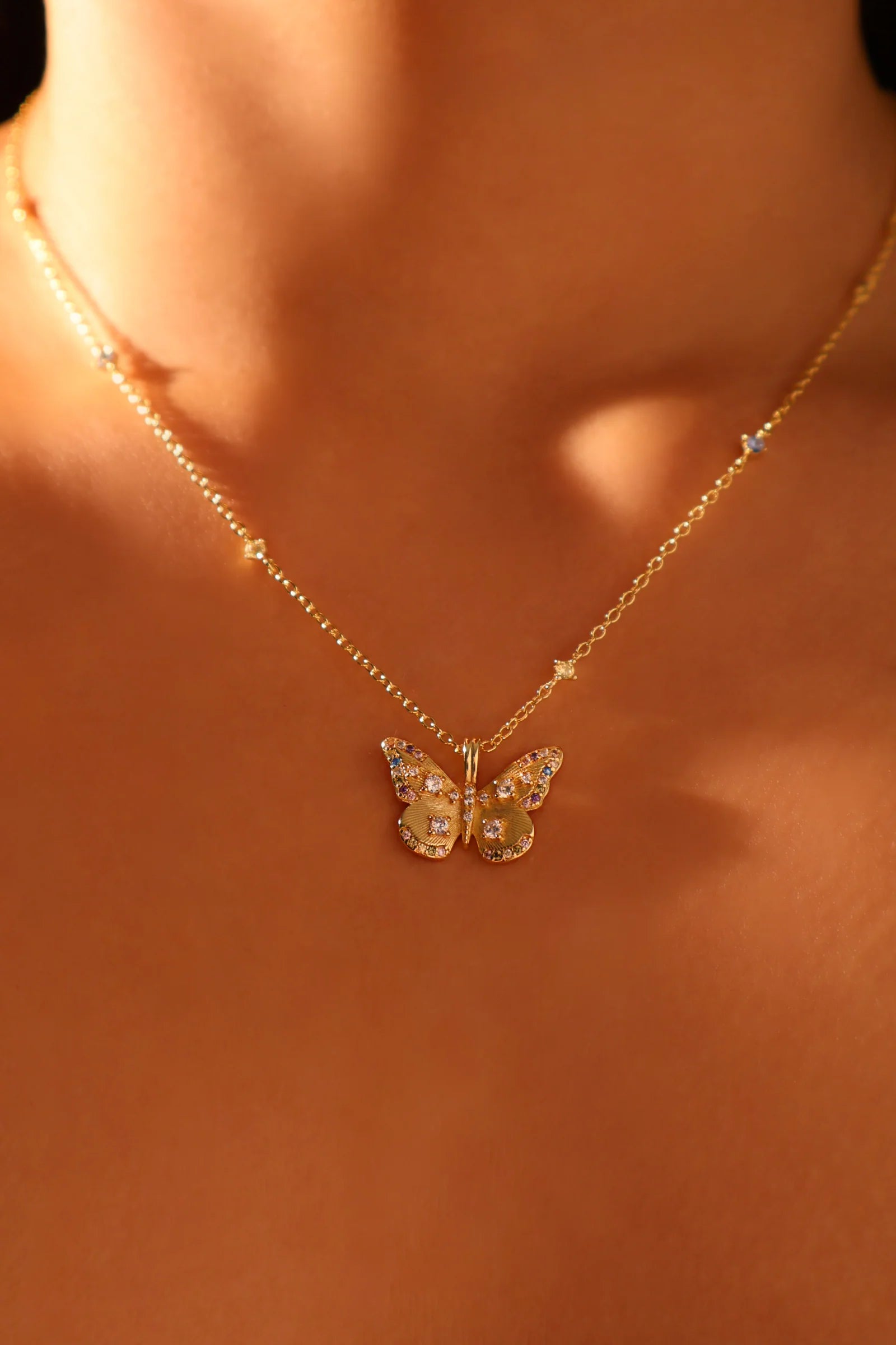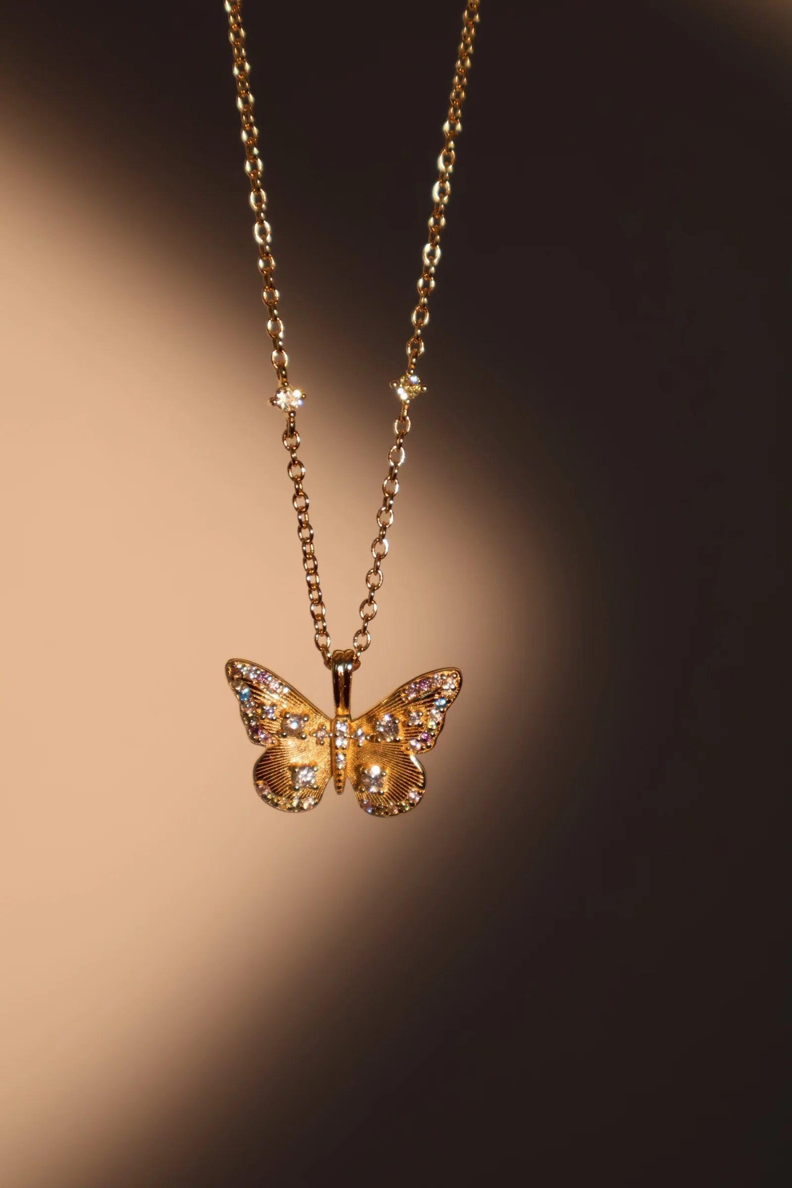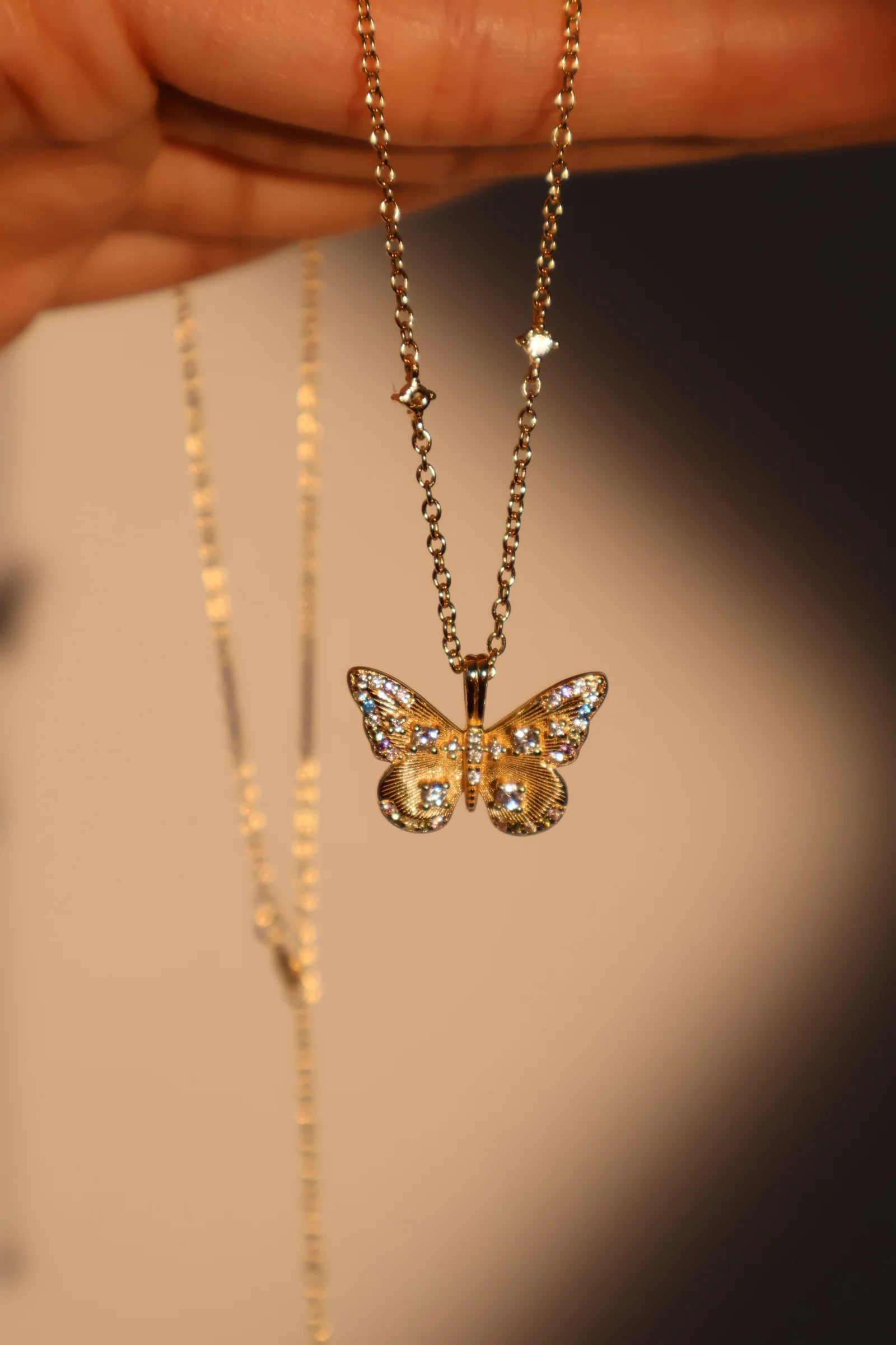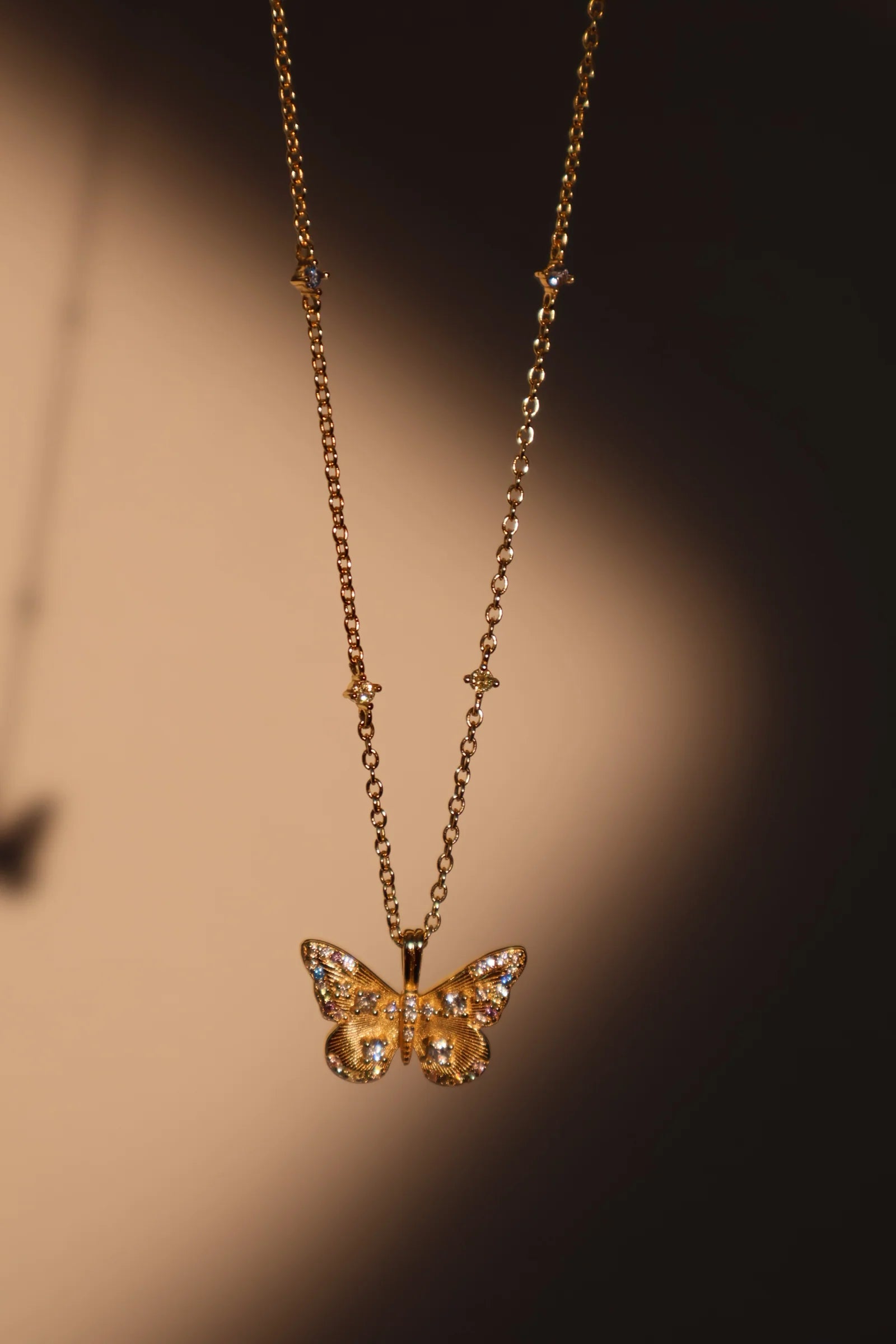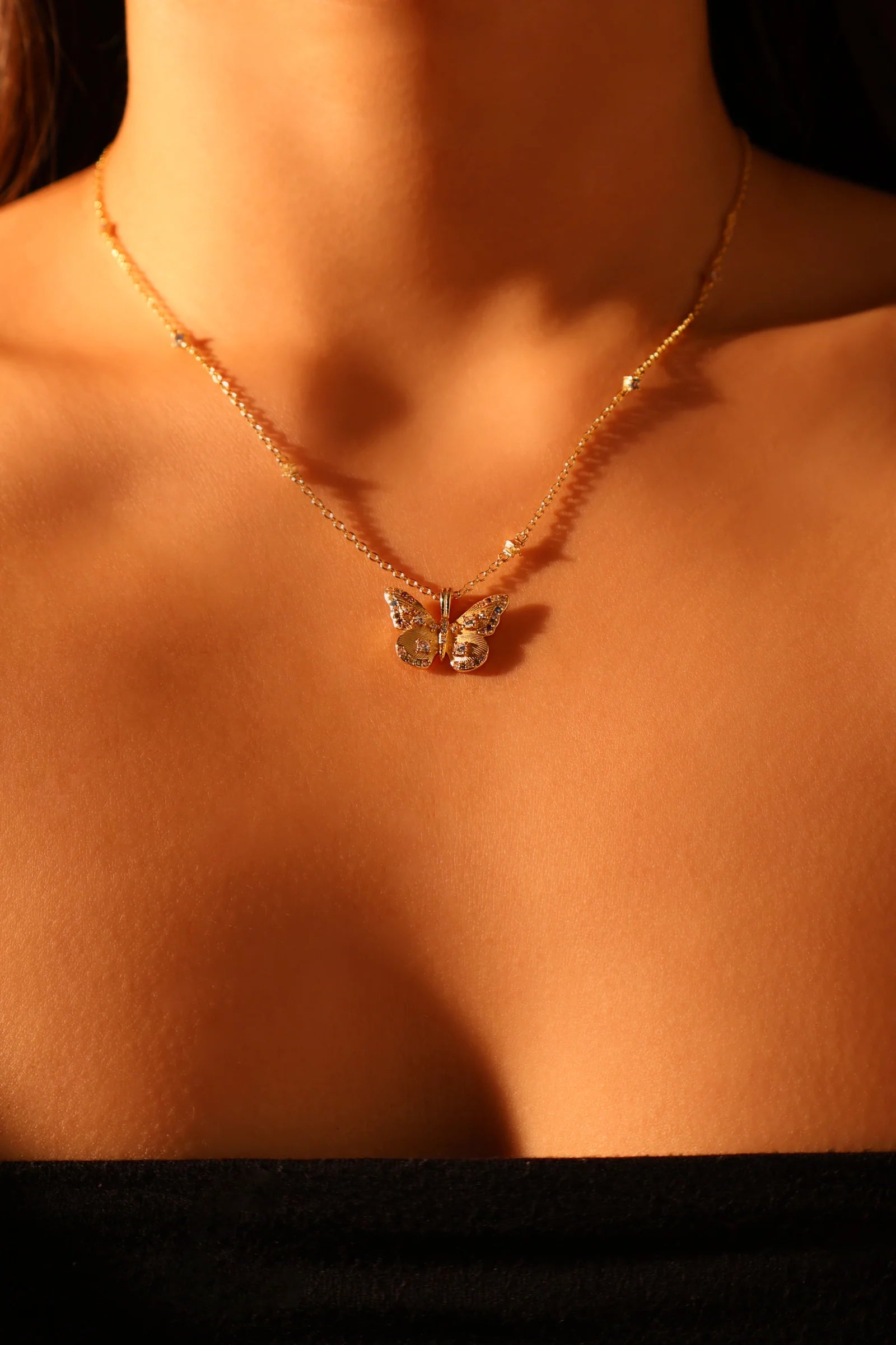 🦋 Matlığa veda edin ve 18 Ayar Altın Işıltılı Kelebek Kolyemizle öne çıkın.