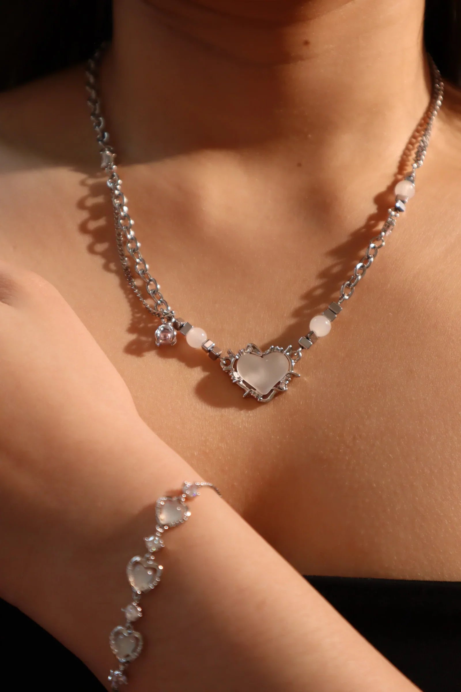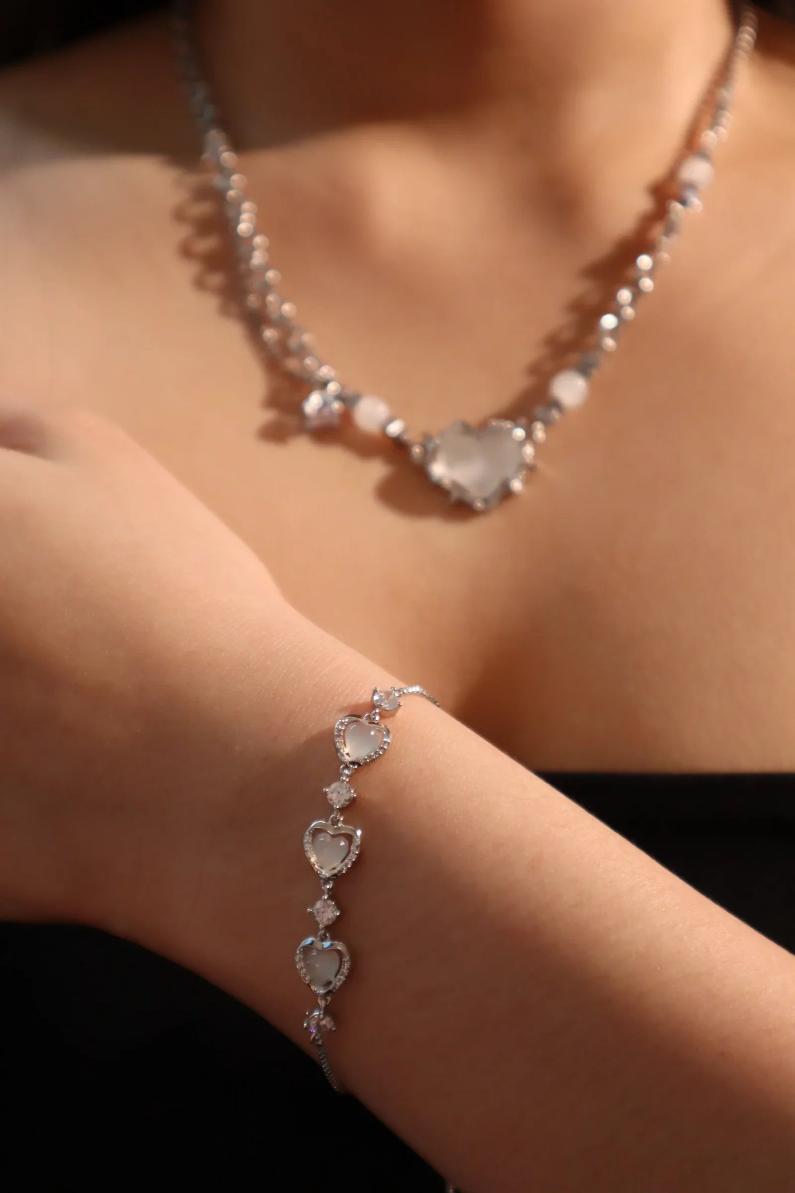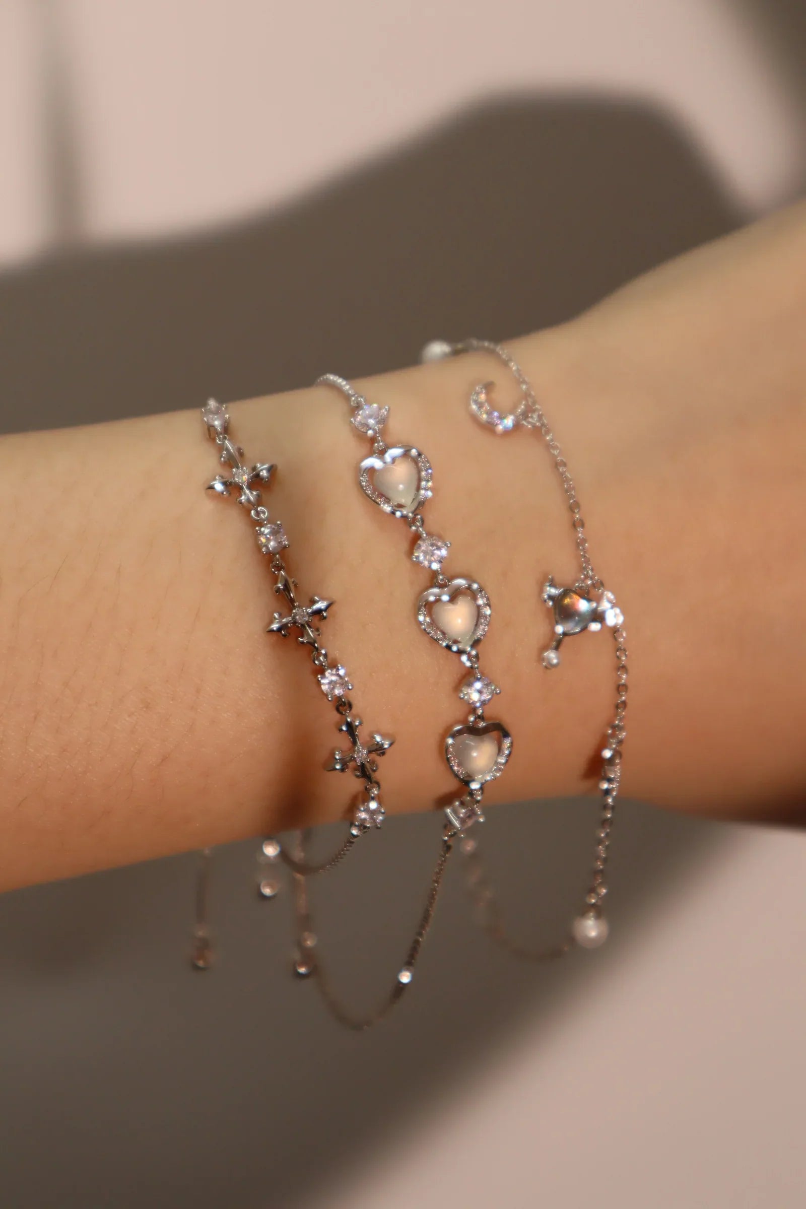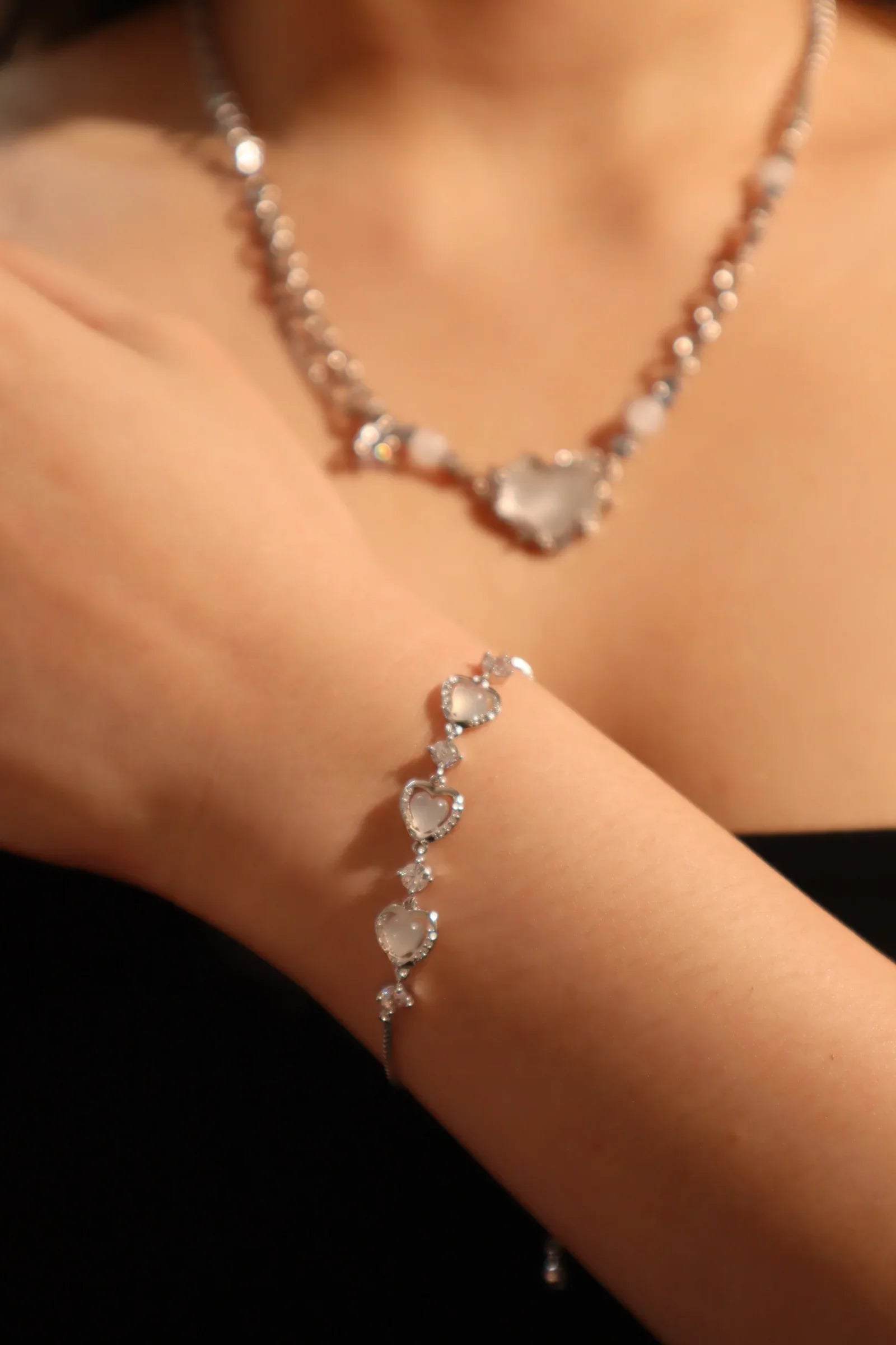 🌟 Ay Işığı Parlayan Kalp Bilekliğimiz büyüleyici bir güzelliğe sahip. Bu bileklik, melekler kadar parlaklık ve ışıltıya sahip kaliteli zirkon taşlarıyla süslenmiştir. Ne giyeceğinize karar veremediğinizde, bu bileklik kurtarıcınız olmaya hazır!