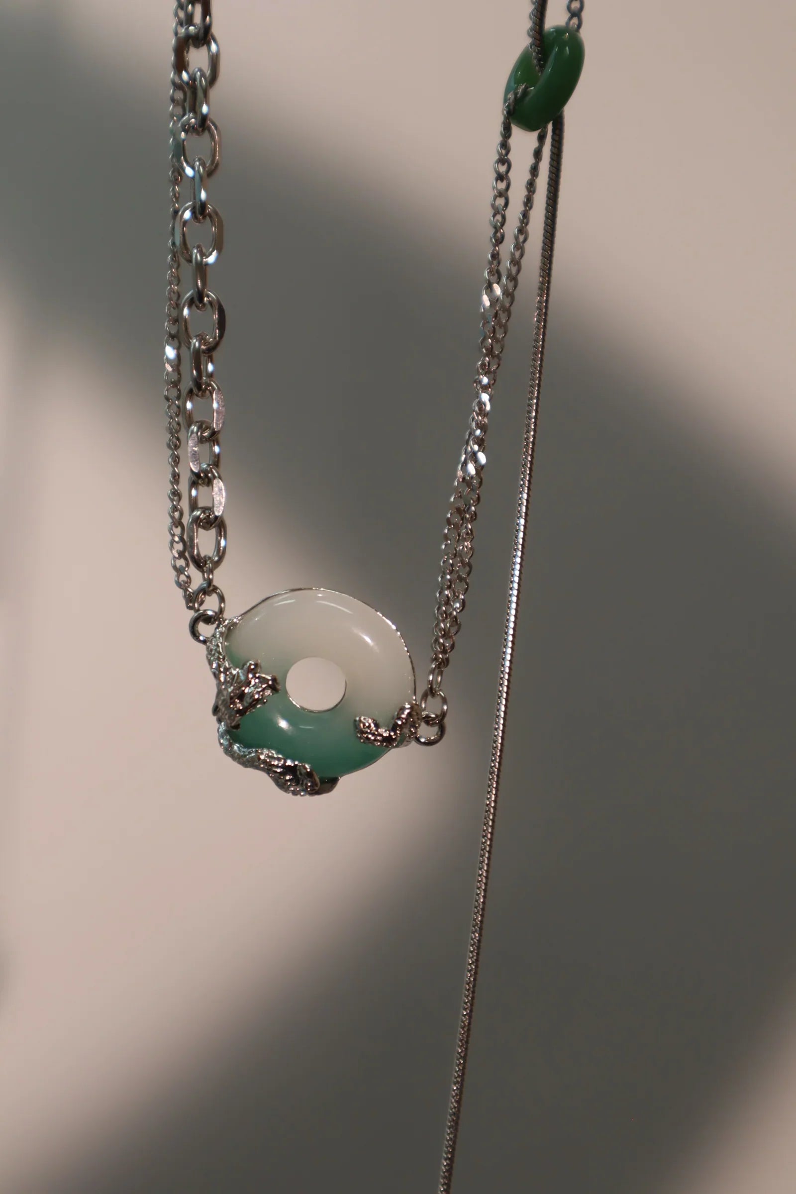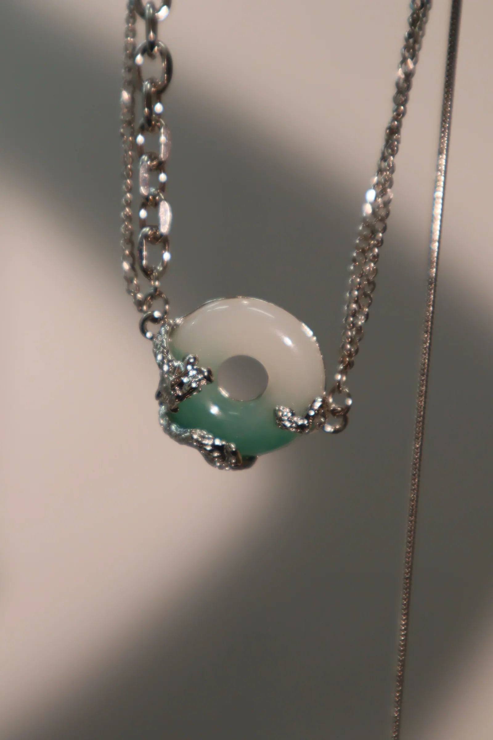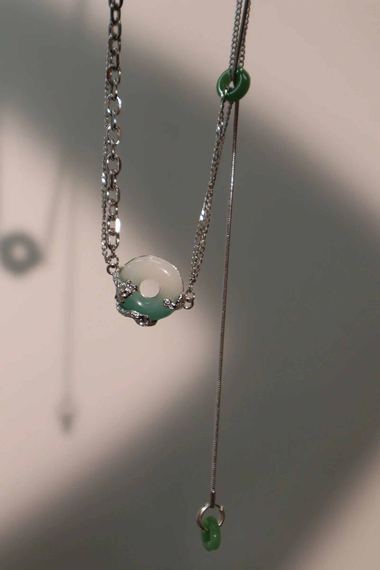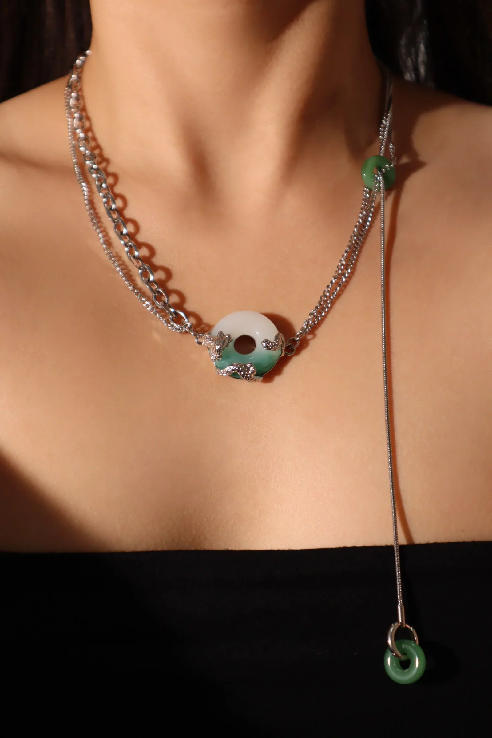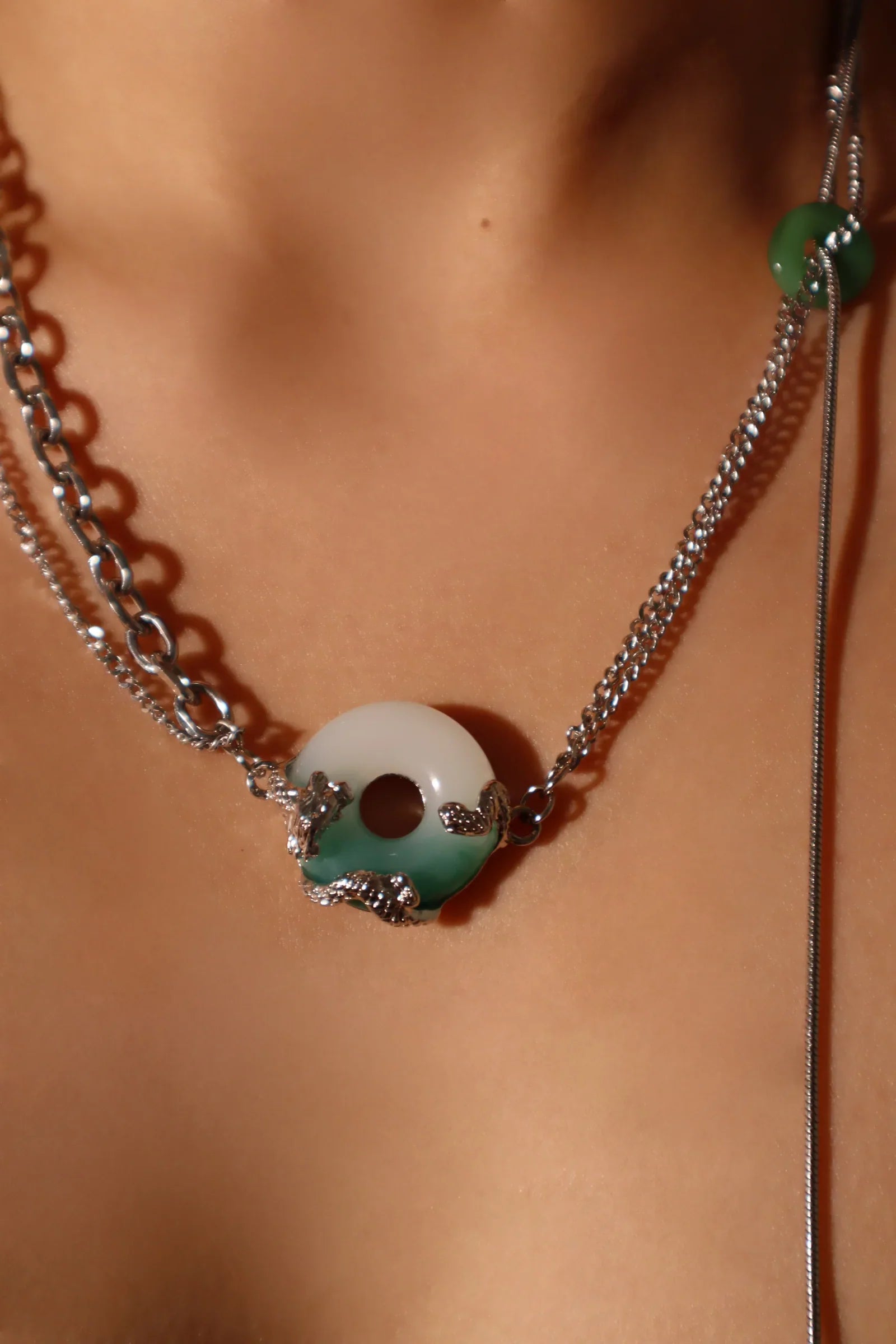 💎 Paslanmaz çelik zincir, gümüş kaplama kolye uçları + iyi kesilmiş akrilik yeşim